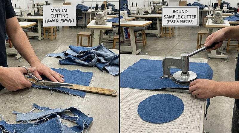Nếu cắt thủ công, bạn phải đo – vẽ – cắt – chỉnh sửa. Còn với máy cắt mẫu vải tròn? Chỉ cần đặt vải, ấn xuống là xong. Mỗi mẫu chỉ mất vài giây, cực kỳ phù hợp khi cần kiểm tra nhiều mẫu trong ngày.