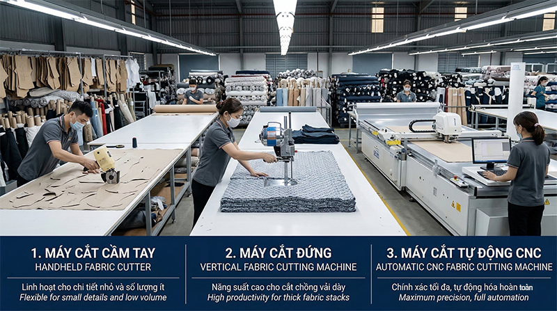 Hiện nay đa số xưởng may tại Việt Nam vẫn dùng máy cắt vải đứng vì cân bằng tốt giữa giá – hiệu năng – dễ sửa.