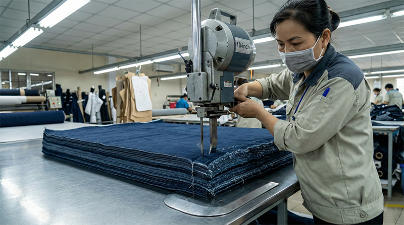 10 lớp denim 14oz có thể tương đương 25–30 lớp cotton thường. Khi xếp nhiều lớp, lực ma sát tăng mạnh, lớp dưới dễ bị kéo trễ và dao yếu sẽ không cắt mà xé vải.